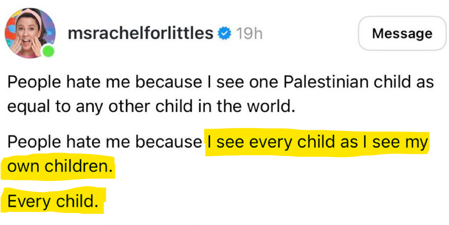 The second giveaway that Ms. Rachel is not merely engaged in children’s advocacy is her repeated, selective use of blame. Though she started with vague hopes for peace that did not mention Israel or Hamas by name, Ms. Rachel has gradually begun including “analysis” in her Instagram posts. She informed her followers that Israel is committing “genocide,” accusing it of “murder[ing] 4 year olds!” and blaming the world for dehumanizing Palestinians to excuse Israel’s conduct.